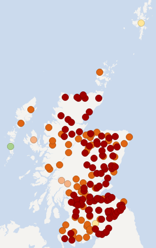 The river catchments of the Deveron, Ythan, Don (Aberdeenshire), Dee (Aberdeen), Esk, Firth of Tay, Firth of Forth, Almond, Tyne (Lothian), Tweed, and Esk (Dumfriesshire) have been raised to Moderate Scarcity.