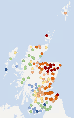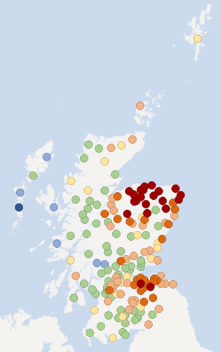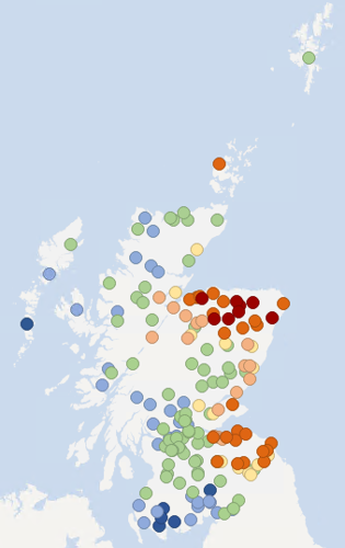 Over the last three months, Moray and Aberdeenshire have been extremely dry. The wider northeast area, much of the Central Belt and the northern isles have been dry to very dry. Elsewhere, conditions have varied between normal and dry, with wet conditions more prevalent in the west. Rivers have shown an east-west split, with generally low to extremely low flows in much of the east, but normal to high flows in the west.